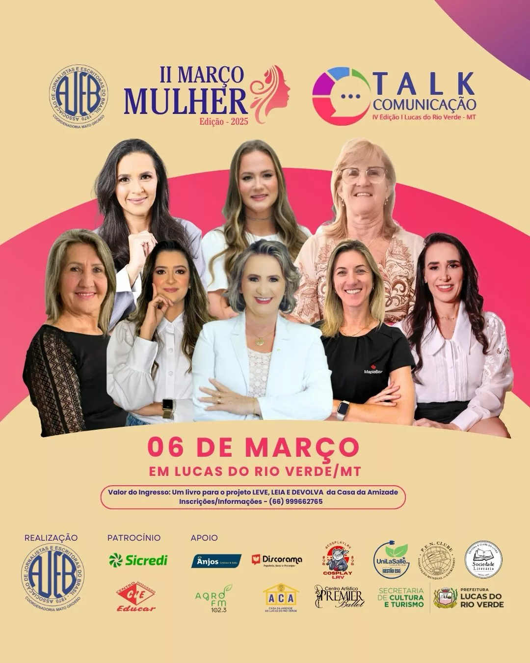O 2º Março Mulher é uma realização da AJEB, com patrocínio do Sicredi e do Centro Integrado Educar, e conta com o apoio da Prefeitura de Lucas do Rio Verde, Anjos Colchões, Agro FM 102,3, Discorama Papelaria, Livros e Presentes, Casa da Amizade, Cosplay LRV, Centro Artístico Ballet, Unilasalle, Pen Clube, Sociedade Literária e Secretaria de Cultura e Turismo.
