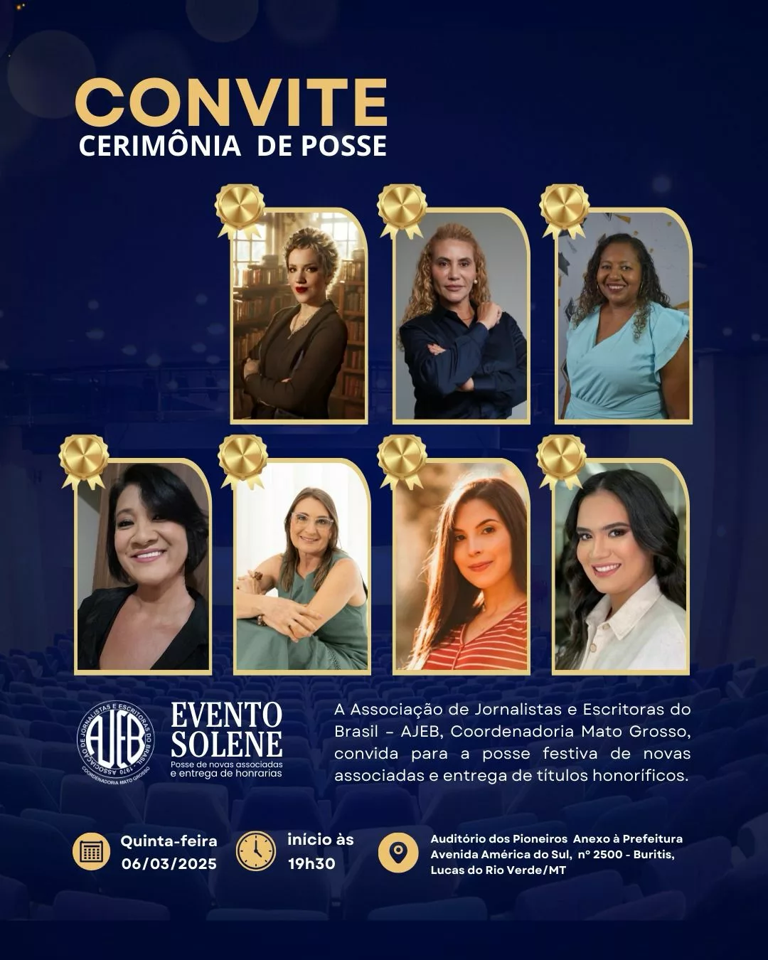 Ainda na quinta-feira, à noite, ocorrerá a posse solene das novas associadas da AJEB/MT. A presidente coordenadora, Leni Chiarello Ziliotto, dará boas-vindas a essas escritoras e jornalistas, momento que será marcado por homenagens às mulheres indicadas pelas novas associadas, através da entrega do título MULHER DESTAQUE.