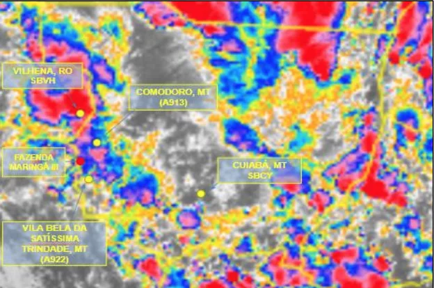 As estações meteorológicas automáticas de Vila Bela da Santíssima Trindade (A922) e Comodoro (A913) do Instituto Nacional de Meteorologia (INMET), distantes 39 e 48 NM, respectivamente, do local da ocorrência, registraram os valores de ventos. Os valores da tabela acima convertidos equivaleriam a ventos de rajada com intensidade entre 7 e 10 kt de intensidade, informaram os profissionais.