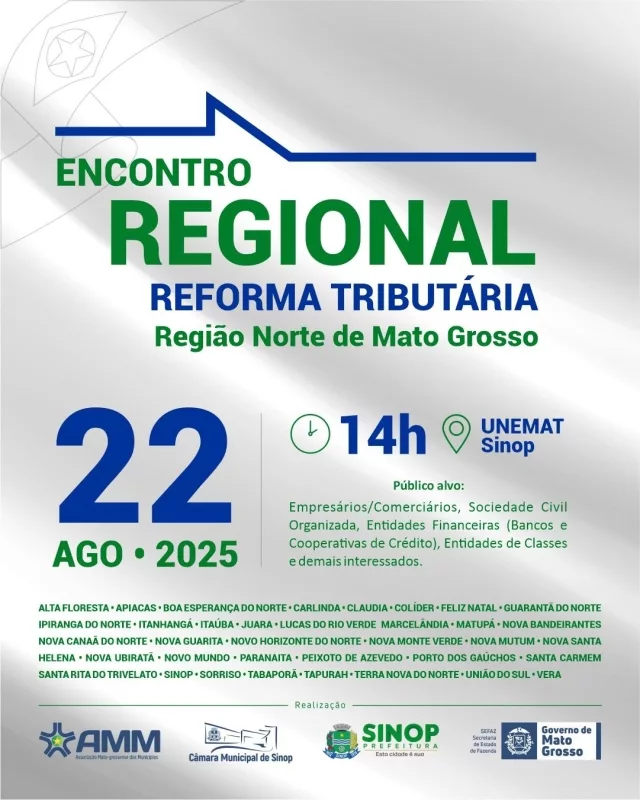 O encontro regional reforma tributária da região Norte de Mato Grosso será realizado em dois grandes momentos: às 8h30, na Câmara Municipal de Sinop, reunindo prefeitos, vereadores e secretários de finanças, planeamento e administração dos municípios. Na parte da tarde, às 14h, será no auditório da Universidade do Estado de Mato Grosso – Unemat, voltado para empresários, comerciantes, sociedade civil organizada, entidades financeiras, entidades de classes e demais interessados.