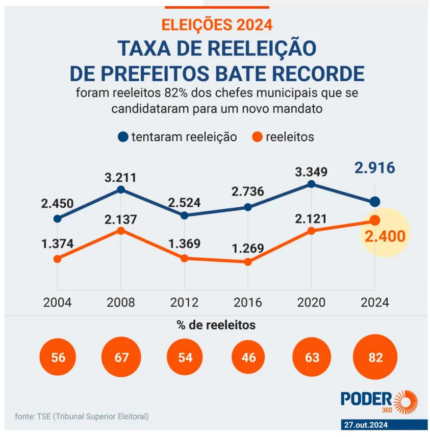 Nas eleições de 2024, dos 2.916 prefeitos que disputaram a reeleição, 2.400 foram reeleitos, mais de 80%, fato inusitado, segundo levantamentos feitos pelo Portal360 com base em dados do Tribunal Superior Eleitoral.