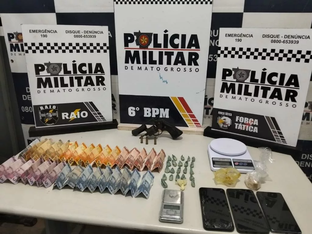 A Polícia Militar prendeu um homem e uma mulher e apreendeu uma adolescente por tráfico ilícito de drogas e posse irregular de arma de fogo, na noite desta quinta-feira (2.4), em Cáceres. Com os criminosos, os policiais apreenderam um revólver, munições e 23 porções de pasta base de cocaína.