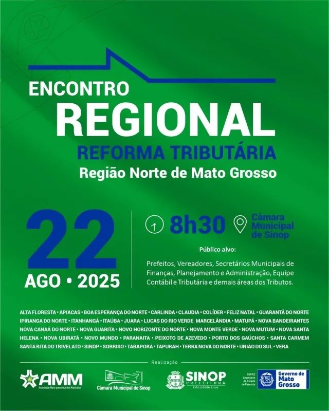 O encontro regional reforma tributária da região Norte de Mato Grosso será realizado em dois grandes momentos: às 8h30, na Câmara Municipal de Sinop, reunindo prefeitos, vereadores e secretários de finanças, planeamento e administração dos municípios. Na parte da tarde, às 14h, será no auditório da Universidade do Estado de Mato Grosso – Unemat, voltado para empresários, comerciantes, sociedade civil organizada, entidades financeiras, entidades de classes e demais interessados.